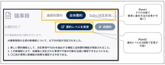 3.会議全体のサマリー要約:会議全体の内容を簡潔にまとめたサマリーを出力する機能を追加しました。これにより、会議の要点を素早く把握できます。また、サマリーの長さは3段階で調整可能です。