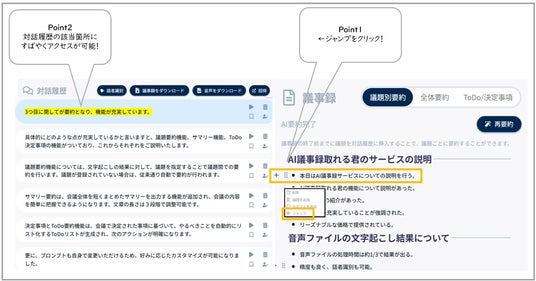 2.要約箇所のハイライト表示:要約された内容がどの発言に基づいているかを色付きで表示し、会議中の該当箇所へすばやくアクセスできるようになります。