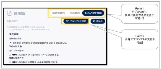 4.ToDoリストの自動生成:会議で決定された事項に基づき、やるべきことを自動でリスト化するToDoリストを生成します。これにより、次のアクションが明確になります。さらに、プロンプトを自由に変更できるため、好みに応じたカスタマイズが可能です。