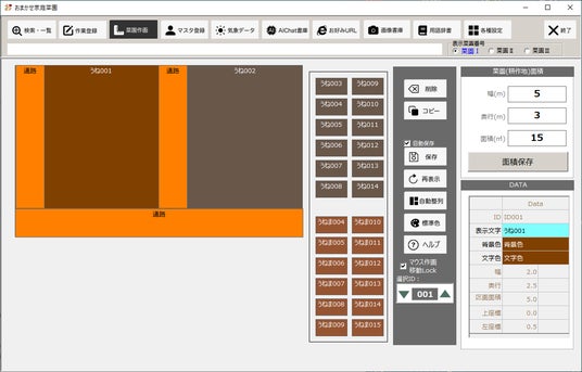 『おまかせ家庭菜園』の操作画面本ソフトではまず「菜園作画」からはじめます。実際の農園のサイズを計測し、図にしていただくことにより、どの畑に何を植えたのかを分かりやすくします。