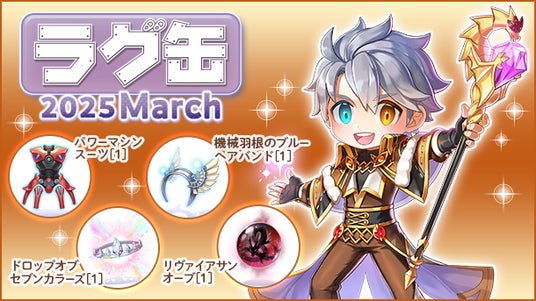 今回のラインナップには「パワーマシンスーツ[1]」、「機械羽根のブルーヘアバンド[1]」、「ドロップオブセブンカラーズ[1]」、「リヴァイアサンオーブ[1]」といった新アイテム4種が登場。「ラグ缶2025 March」をどうぞお楽しみください。