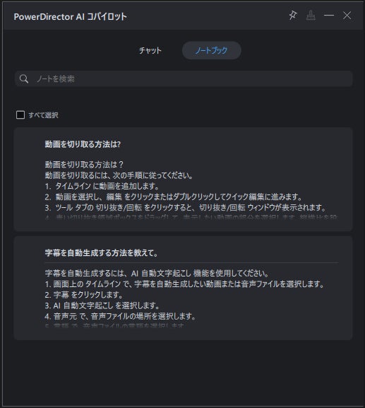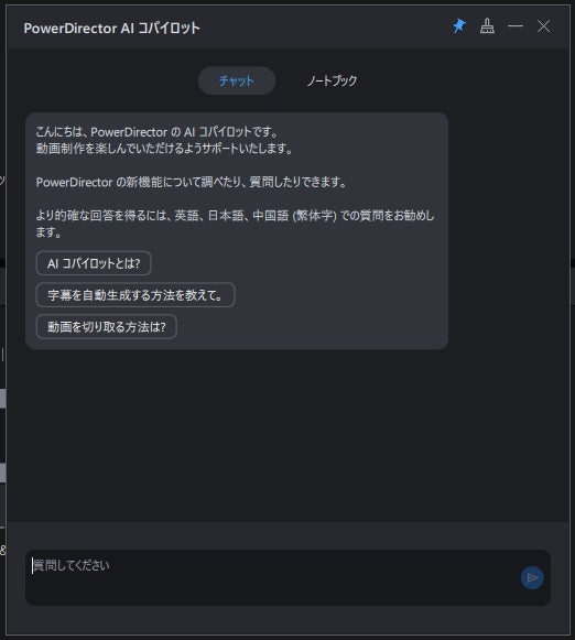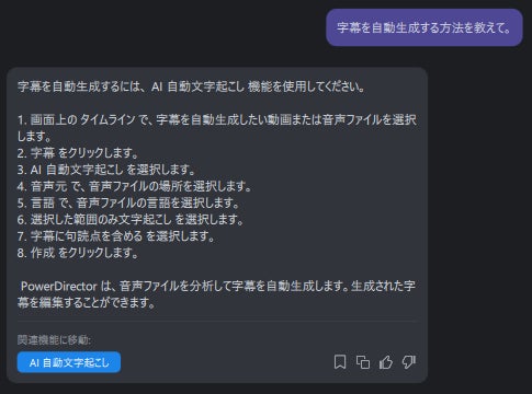 PowerDirector 365のAIコパイロット機能は、チャット形式で動画編集に関する質問をすると、編集の手順や使用方法を教えてくれる機能です。回答にはディープリンクが含まれており、必要なツールに素早くアクセスできるため、効率的に編集を進められ、動画編集の生産性が向上します。
