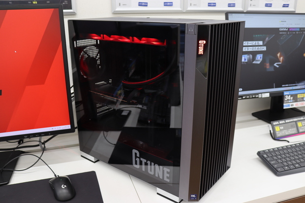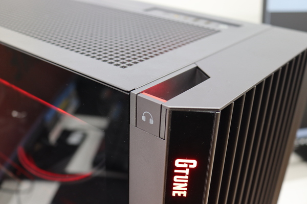 新たなデザインとなったPCケースは、フロントパネルが通気性の高いメッシュ構造になっており、アルミ素材によるスリット状の意匠が施されています。サイドパネルは強化ガラスで、筐体各所にはG TUNEの新デザインロゴが描かれており、筐体内もブランドイメージカラーの赤色でライティングされています。