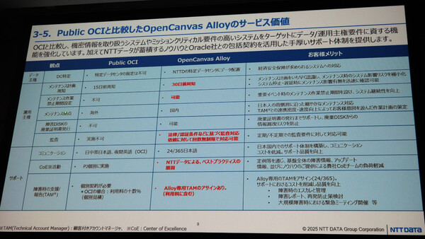 この発表時点で明らかにしていたとおり、NTTデータでは、高セキュア/高SLA対応をうたうプライベートクラウドの「OpenCanvas」にAlloyを組み合わせて拡張し(以下、OpenCanvas Alloy)、ソブリンニーズも引き続き満たしつつ、メガクラウド(OCI)のアジリティや先進性を取り込んでいく「いいとこ取り」の方針だ。OpenCanvas Alloyは、東日本リージョンで2025年中に、西日本リージョンで2026年中にリリースの予定としている。