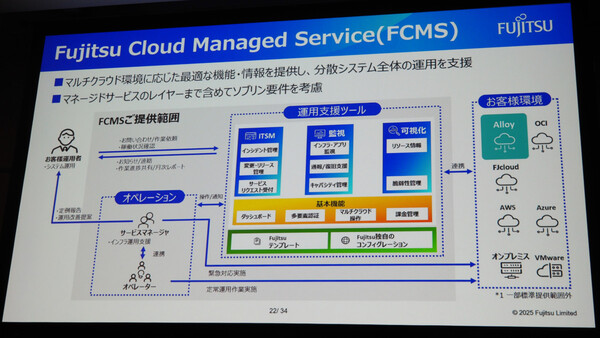 なお、富士通ではハイブリッド/マルチクラウド環境のマネージドサービスである「Fujitsu Cloud Managed Service(FCMS)」を提供しているが、これについてもソブリン要件を満たせるよう、新たに「国内での運用人員体制を準備している」(谷内氏)と説明した。