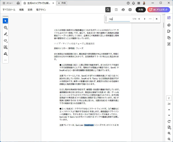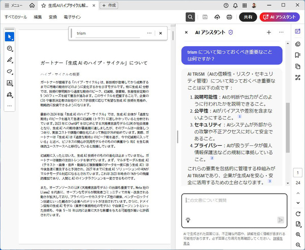 検索フォームに探したいキーワードを入力すれば、Acrobat AI アシスタント(以下、AI アシスタント)を持っている人は完全一致する箇所の数や入力する提案キーワードが表示される。「AI TRiSM」の「rism」など一部の文字を入力する場合は、リアルタイムには検索しないものの、Enterキーを押せば検索できる。