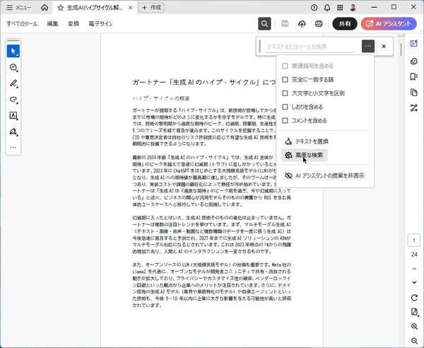 「簡易検索」フォームの右側にある「…」をクリックし、「高度な検索」をクリックしよう。検索ウィンドウがAcrobatの左側に現れる。開いている文書を検索するなら、「現在の文書」を選択したまま、キーワードを入力。「完全に一致する語のみ」にチェックして検索してみよう。「Snapdragon」や「GraphRAG」といった単語はヒットしなくなる。
