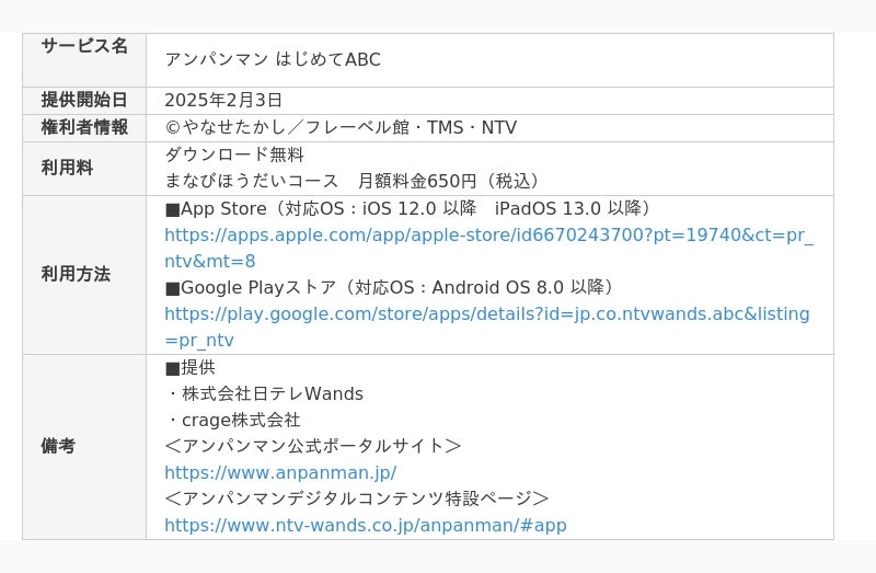 日テレWands(本社:東京都港区、代表取締役社長:鈴木 重利)は、アンパンマンの幼児向け英語アプリ「アンパンマン はじめてABC」を配信開始しました。本アプリはアンパンマンとして初めての英語学習アプリです。