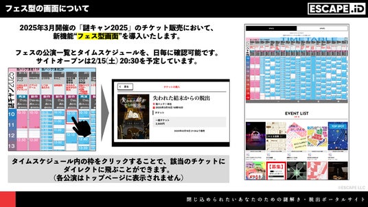 ESCAPE合同会社(所在地:東京都品川区、統括プロデューサー 佐々木 翼)の運営する謎解き・脱出ゲームに特化したチケットポータルサイト「ESCAPE.ID」は、多くの謎解き団体が集まる"フェス型イベント"に特化した販売ページ画面「フェス型画面」を新たにリリースしました。