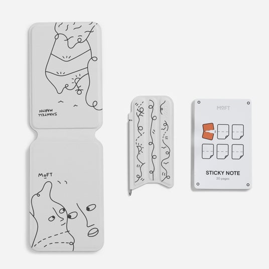 Shantell Martinは、アイデンティティとインターセクショナリティ、そして人間の体験というテーマを独特な黒と白のラインで探求する作品で知られています。今回のコラボのために、Shantell MartinはMOFTインスピレーションスタンド&ノートにインスパイアされたオリジナルイラスト『All the Time』を描きました。