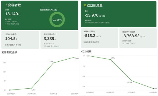 このダッシュボードには、本プロジェクトに参画した4社(ジオテクノロジーズ株式会社、株式会社unerry、株式会社ブログウォッチャー、株式会社データインサイト)が実施したナッジ施策より、行動変容者数、脱炭素値が連携され、リアルタイムで更新されていくシステムです。