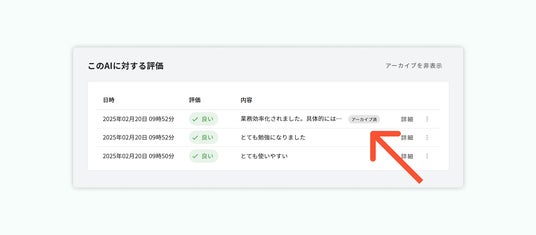 この度、社内からのフィードバックをアーカイブして整理できる機能をリリースいたしました。ChatSenseの「追加学習」機能では、複数のRAGの作成が可能です。また、利用者は、それぞれのAIの利便性について、「フィードバックコメント」をすることが可能です。この度リリースした「フィードバックのアーカイブ機能」機能では、その複数のRAG、それぞれで、利用者からの評価を簡単に整理することができるようになっております。