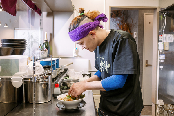 異業種からこの世界に飛び込んだという佐竹さん。もともと熱心な「ラーメンフリーク」で、前職時代から休日になれば行列に並び、県内外の名店を食べ歩いていた。脱サラして県内のラーメン店で基礎を学び、理想の一杯を追究しようと「一途一麺 來神」を開店したのが2021年12月。