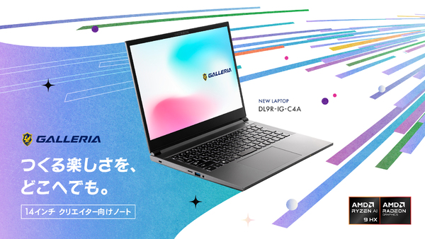 サードウェーブは、2月20日からクリエイター向けの14インチノートPC『GALLERIA DL9R-IG-C4A』を販売開始した。価格は199,980円で、最新技術を取り入れたこのモデルは、AI PC向けプロセッサのAMD Ryzen AI 9 HX 370を搭載している。