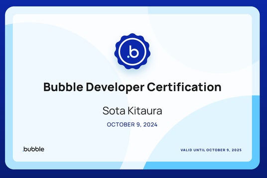 " Bubble公式が認定している唯一の認定資格となります。Bubble認定開発者になることは、優れた仕事を行うために必要なスキル、才能、および Bubble のプラットフォームに対する包括的な理解を持っていることを客観的に証明する方法です。この資格は、レスポンシブデザインからデータベースのセキュリティやパフォーマンスまで、あらゆる専門知識の深さを証明した上級Bubble開発者であることを示しています。"