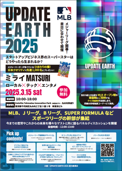 一般財団法人UPDATE EARTHは、MLB(メジャーリーグベースボール)の開幕に合わせて、3月15日に「UPDATE EARTH 2025ミライMATSURI」を開催する。会場は東京都千代田区の新東京ビルとその周辺で、参加は無料だ。