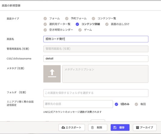 2.画面タイプを「コンテンツ詳細」、画面名を「招待コード発行」などに変更して保存ボタンを押します。