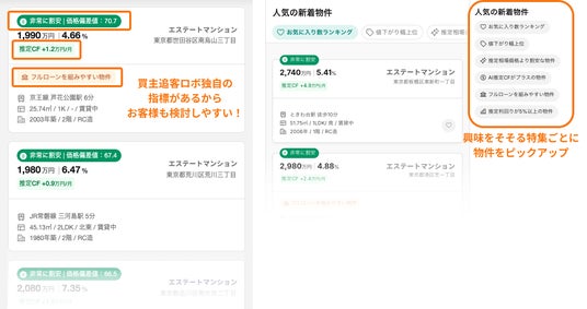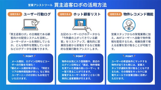 これにより、昨今住宅ローン金利変動の影響により購入タイミングに迷う消費者が増える中、長期的になりがちな追客行動を『買主追客ロボ』が自動物件提案を行い反響を獲得するという既存機能に加え、物件ページへアクセスしているホットな顧客を可視化できることでタイミングを逃さず営業アプローチが行えるようになりました。