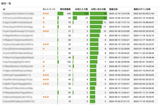 顧客の物件閲覧数、お気に入りの登録物件数、直近のログイン時間などのデータを用いて、「今、架電やメールをすべき顧客が優先順位順に、一覧で見れる」ユーザーログ機能です。