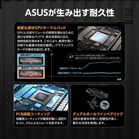 GPUとサーマルモジュールの隙間を溶けて埋めることで、優れた熱伝導性と熱放散を実現し、重負荷時でもグラフィックスカードの最適な性能と長寿命を確保。