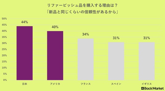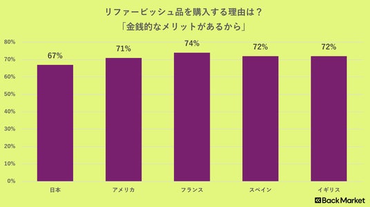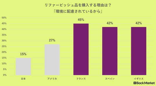 続いて、「リファービッシュ品を購入する理由」について聞いたところ、全ての国で「金銭的なメリット」が1位にあがりました。次点で、フランス、スペイン、イギリスの欧州においては40%以上が「環境への配慮」を理由にリファービッシュ品を購入する一方で、日本と米国においては「新品と同じくらいの信頼性があるから」と回答しました。この「環境配慮」に関する点は、日本ではわずか15%となっており、欧州のエシカル消費の意識の差が浮き彫りとなっています。