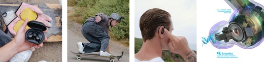 イヤホン内・外に組み込まれたハイブリッド型の高性能マイクがノイズを的確に判断。ノイズキャンセリングモード、外部音取り込みモード、オフの3パターンで、オーディオと外音のバランスを自在にコントロールします。