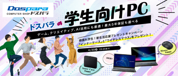 サードウェーブが運営するパソコン専門店ドスパラは2月21日、全国の店舗および通販サイトで「頑張れ学生!新生活応援プレゼントキャンペーン」を開始すると発表した。中学生以上の学生を対象に、対象ノートPCを購入すると、無料でインナーケースとワイヤレスマウスがプレゼントされる。