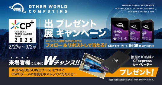Other World Computing, Inc(OWC:米国イリノイ州ウッドストック)は、2025 年2月27日(木)~3月2日(日)にパシフィコ横浜で開催されるカメラと写真映像のワールドプレミアショー「CP+2025」に出展いたします。製品展示の他、プロの写真家の作品を展示したギャラリースペース、有名写真家によるフォトウォークなども開催ます。またCP+2025期間中にアマゾンOWC直営公式ストアではセール価格での販売を行います。