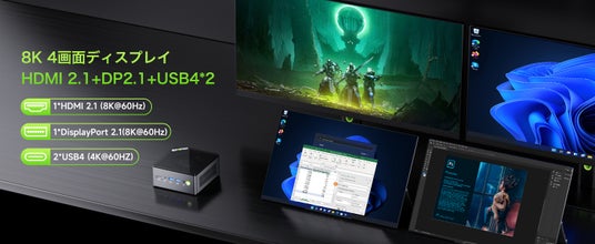1つのHDMI 2.1ポートと、DisplayPort、Type-Cポートで最大4つのディスプレイを接続可能。8K解像度や4K60Hzにも対応し、作業効率を大幅に向上させます。