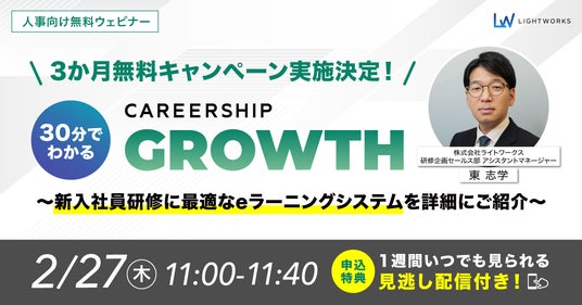 こうした状況を受け、ライトワークスは、中小企業が新入社員研修をより手軽に、かつ効果的に実施できる環境を提供するため、新入社員研修に最適な教材を搭載したeラーニングシステム「CAREERSHIP GROWTH」を3か月間無料で利用できるキャンペーンを実施します。