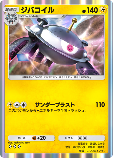すっかり現環境の主役に躍り出た感のあるジバコイル。2進化ポケモンなので、ベンチで育てる必要があるが、前線を支える先鋒ポケモンと組み合わせることでちょうどいいフィニッシャーとして活躍中
