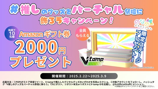 渋谷モディにて期間限定で開催される「のなめぷろだくしょん」POPUPストアにご来場いただき、来場の様子をXで投稿してくださった方全員に限定バーチャル祭壇をプレゼントいたします。また、会場に来られない方もV-tampのバーチャル祭壇にのなめぷろだくしょん所属VTuberのデジタルグッズを飾り、キャプチャ画像をX投稿いただいた方を対象にバーチャル祭壇をプレゼント。加えて、抽選で10名様にAmazonギフトカード(2,000円分)をプレゼントいたします。キャンペーンに参加して推しのグッズをSNSで拡散しましょう!
