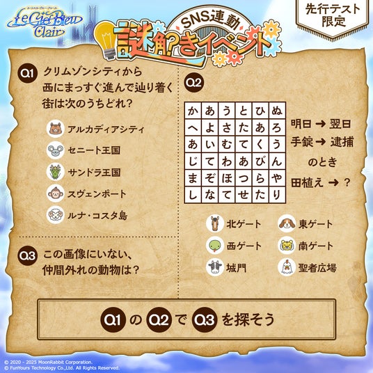 本イベントは、ゲーム内や公式X(@LCBClair_PR)から出題される謎を解きながら、「Le Ciel Bleu Clair~ル・シエル・ブルー・クレール~」のゲーム内の各街を巡る、ゲーム内周遊型謎解きイベントとなっております。イベントをクリアした方は、特別なペットカード「月のうさぎカード」がもらえます。
