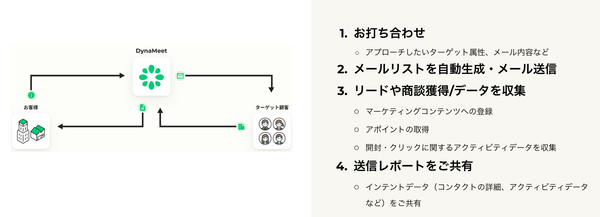 「DynaLead」は、300万社以上のデータから顧客企業の商品やサービス導入に関わる意思決定者や決済者の新規営業リストをAIが自動抽出してリストを作成し、ターゲットに対してメールによる営業までワンストップで行うというサービス。