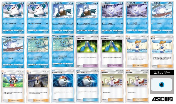 カスミ以外のサポートカードは、初手のポケモンを入れ替えたいとき用のリーフを1枚、ユキノオーで確実にフィニッシュを決めるためのアカギ。ポケモンのどうぐには、マナフィをできるだけ延命させるための大きなマントを2枚採用しています。