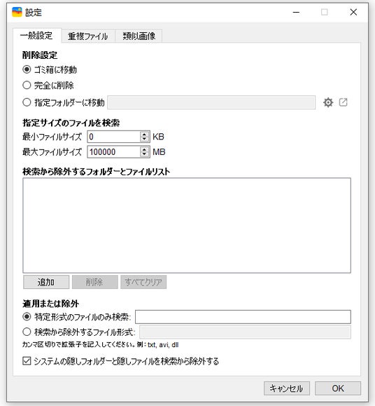 このソフトはインターフェースが直感的で使いやすいです。重複ファイルを検索・削除する方法がカスタマイズできます。例えば、重複ファイルを検索する時に特定のファイルとフォルダを除外するように設定します。