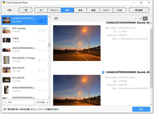 検索結果画面でファイルの種類をクリックして重複ファイルを確認できます。例えば、「画像」タブでは重複画像しか表示されません。また、画像プレビュー機能を使って重複写真を横並びして比較できます。