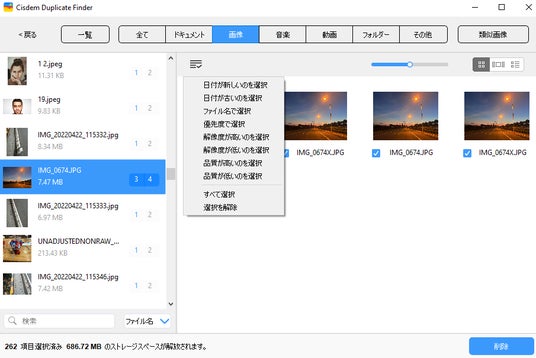 各グループの重複ファイルから自動で1つのファイルを残し、他のファイルを選択して削除します。一括選択のために、「日付が新しいのを選択」のような選択肢が複数提供されます。そのほか、ユーザーは手動で選択したり、選択解除したりできます。
