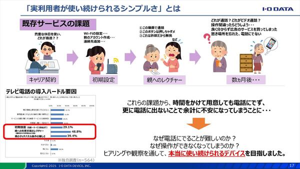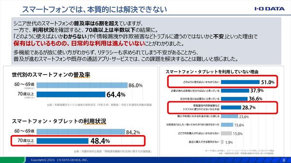 アイ・オー・データ機器は今回のmemet事業を展開するにあたり、「脱・スマート化」を掲げている。1台の端末にすべての機能を集約することで便利にはなったが、その一方で複雑すぎて使いこなせない、使い続けられない、トラブルに巻き込まれるといったデジタル弱者も多く生み出している。その結果、コミュニケーションの断裂が起き、社会が分断される懸念もある。