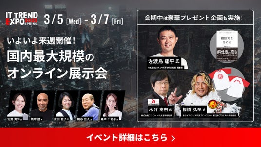 audioコーパス株式会社(本社:東京都豊島区、代表取締役:森井 直哉、以下 当社)は、2025年3月5日(水)~7日(金)にIT業界最大級のオンライン展示会「ITトレンドEXPO2025 Spring」のデータアノテーションのブースに出展します。