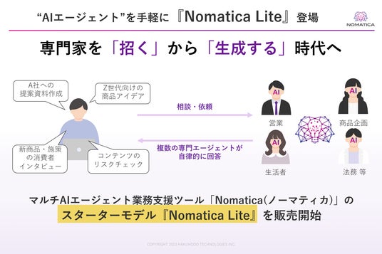 株式会社博報堂テクノロジーズ(本社:東京都港区、代表取締役社長:米谷 修、以下博報堂テクノロジーズ)は、独自のマルチAIエージェントが自律的に連携し適切な回答や多様な企画案を提供するWebサービス「Nomatica(ノーマティカ)」の一部機能を制限することで、導入しやすい新価格となった「Nomatica Lite」を販売開始することを発表します。
