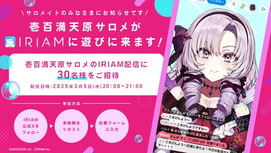 株式会社ディー・エヌ・エー(本社:東京都渋谷区、代表取締役社長兼CEO:岡村 信悟)の子会社である株式会社IRIAM(本社:東京都渋谷区、代表取締役:増田真也)が運営する、新感覚Vtuberアプリ『IRIAM』において、2025年3月5日(水)にVTuber/バーチャルライバーグループ「にじさんじ」所属の"壱百満天原サロメ"が配信を実施します。