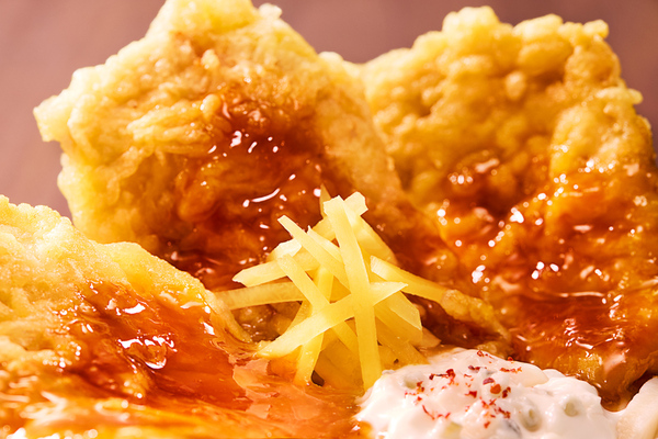 揚げたてサクサクの豚天に、甘辛しょうがダレとコク深いタルタルソースが絡み合います。千切りしょうがやシャキシャキの大根・水菜も添えられ、さっぱりとした後味に仕上がっています。