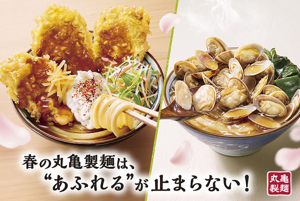 丸亀製麺は3月4日から、「甘辛しょうがダレのはみ出る豚天ぶっかけうどん」と「山盛りあさりうどん」を期間限定で販売します。
