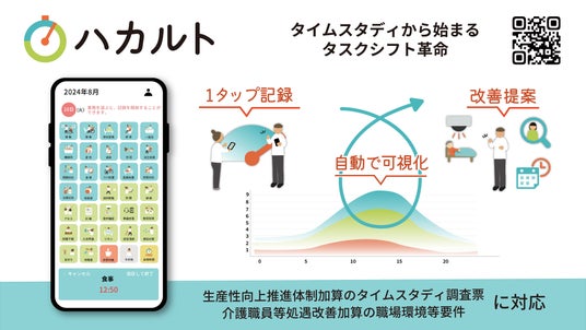 「ハカルト」は、わずか1タップでタイムスタディ調査が行えるアプリです。さらに、施設系・居住系サービスだけでなく、在宅サービスおよび地域包括支援センターでのタイムスタディが可能であり、介護業界全体での生産性向上を目指します。