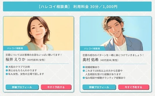 料金は30分1000円から前払い制。安心リーズナブル。受付時間は10:00~11:30まで。夜の営業は24:00まで行っています。それぞれの相談員のプロフィールを見ての指名相談もできます。現在、8人の相談員が受付しております。LINE登録での簡単な申し込みです。もちろんマッチングアプリに関係なく恋愛相談も受け付けております。