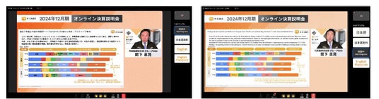 株式会社ブイキューブ(本社:東京都港区、代表取締役社長 国内CEO:高田雅也、以下 ブイキューブ)は、2025年2月21日に2024年12月期決算説明会を開催したことをお知らせいたします。本説明会は完全オンライン形式で実施され、日英同時通訳を導入しました。配信には、当社のオンラインイベントプラットフォーム「VCP for Events」を採用。これにより、参加した投資家は、日本語の決算説明資料を日本語で視聴できるだけでなく、画面上の言語選択ボタンを使用することで、英語の同時通訳とともに英文の決算説明資料をリアルタイムで視聴することが可能となりました。本取り組みは、東京証券取引所がプライム市場上場企業に対し、2025年4月より義務付ける日本語・英語の同時情報開示に対応するものです。