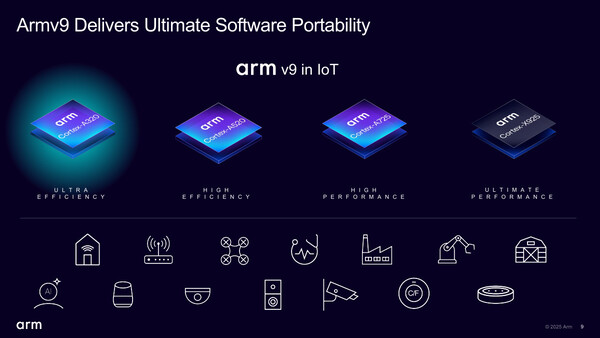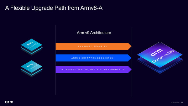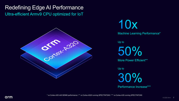 今回発表されたエッジAIプラットフォームを構成するCortex-A320 CPUは、Armv9アーキテクチャのCPUシリーズでは最小モデルとなり、高い効率性を特徴としている。