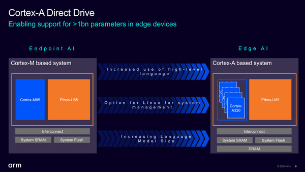 英Arm(アーム)は2025年2月27日、Armv9アーキテクチャベースでは初めてとなる、IoT向けに最適化された“エッジAIプラットフォーム”を発表した。IoT向けの新しい64ビットCPU「Arm Cortex-A320」と昨年発表したAIアクセラレーター(NPU)「Arm Ethos-U85」を組み合わせた構成で、10億パラメーター以上のAIモデルをオンデバイスで実行できるようになるという。