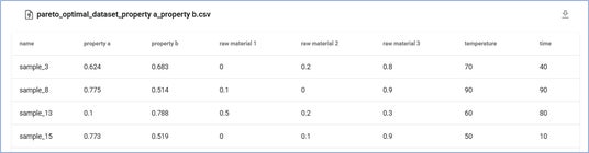 新規の材料を開発するプロセスにおいて、例えば、強度と柔軟性、耐久性とコストなど、相反する特性がある中で、最適な性能を示す材料の実験条件を探索することが多くあります。パレート最適解とはトレードオフ関係の中でそれ以上改善の余地のない最適な組み合わせの候補群を指します。今回の可視化機能では、例えばDatachemical LABにてAIにより算出された大量の未知の実験条件の予測結果の中から、相反する2つの特性においてパレート最適解が簡単に識別できます。パレート最適解をもとに、次に検討すべき実験条件が判断しやすくなります。